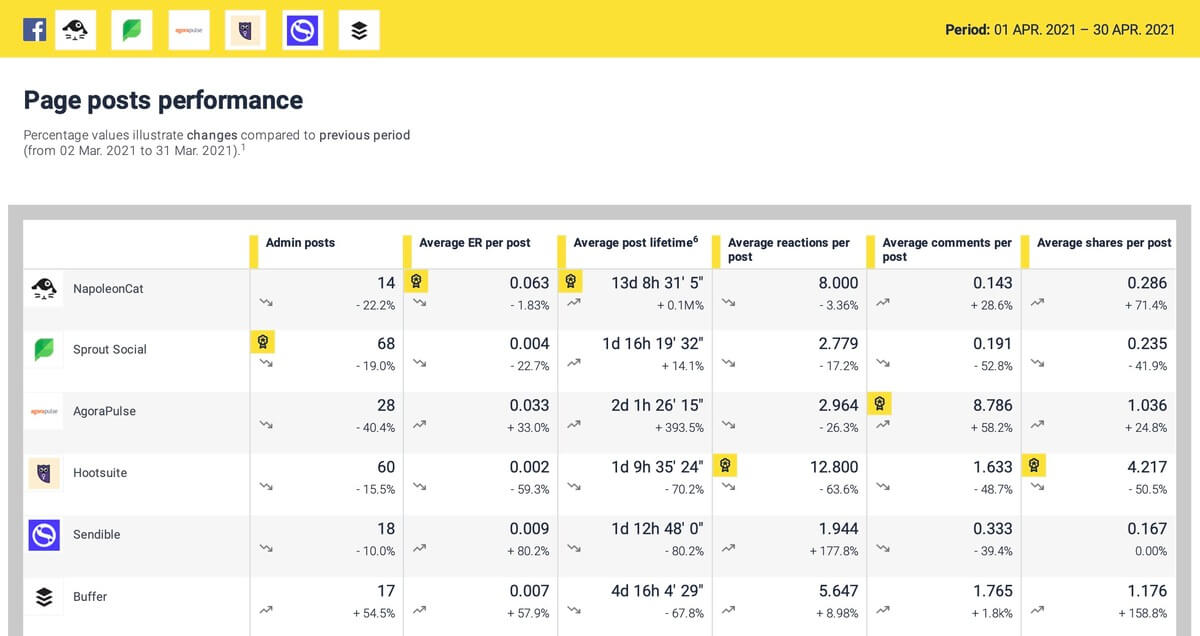 You can also generate competitive reports and track your competitors on social media. For Facebook, you can create a comparative report for up to 8 Pages at once.