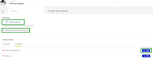If you wish to use the white label reporting option, you can personalize the social media report by removing NapoleonCat branding and uploading your company’s or client’s logo.