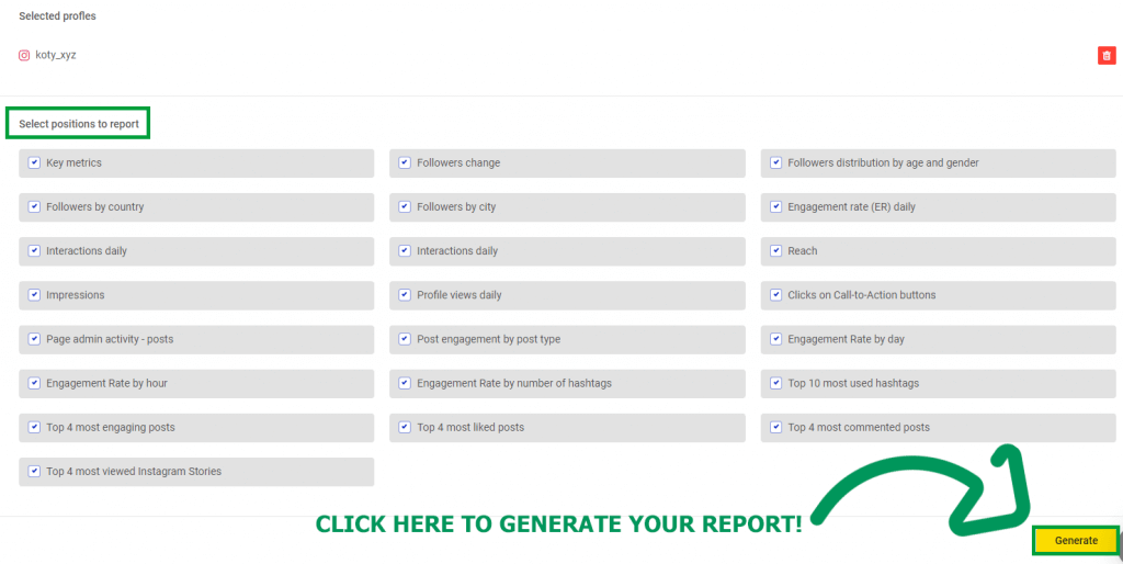 Try to think about the metrics that best reflect your business profile and KPIs and check the corresponding boxes. Now just click the ‘Generate’ button in the right lower corner and watch the magic happen!