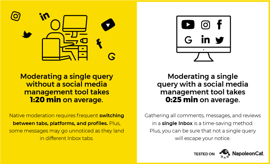 We conducted an experiment; we moderated eight different types of queries from various social media platforms manually (or, more precisely, using the native solutions available on the social media platforms) and using a social media management tool. We tested moderation on NapoleonCat (but no animals were harmed during this experiment 😉). Here’s what we’ve found:
