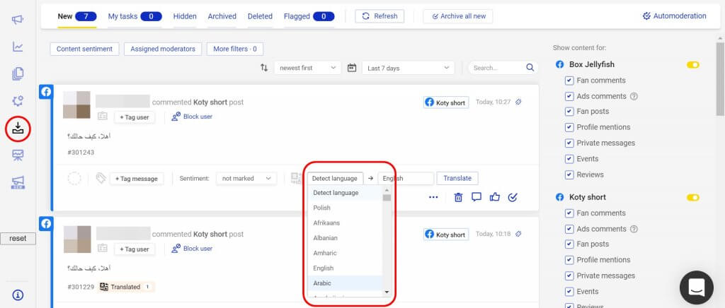 For all the incoming communications in our Social Inbox, you can detect the language and translate it into any (available) language, most probably – your native language.