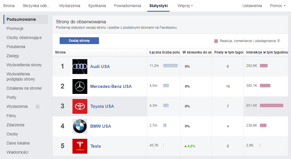 To najprostszy sposób śledzenia konkurencji na Facebooku. Niestety dane udostępniane we wbudowanych statystykach facebookowych są bardzo ograniczone.