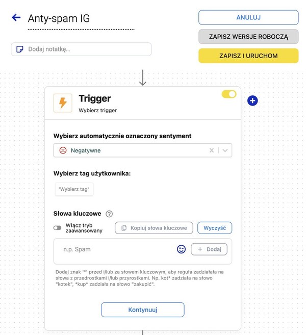 - typ treści, na którą należy zareagować – np. komentarz lub DM. Możesz również, na przykład, zastosować regułę tylko do komentarzy z linkami.