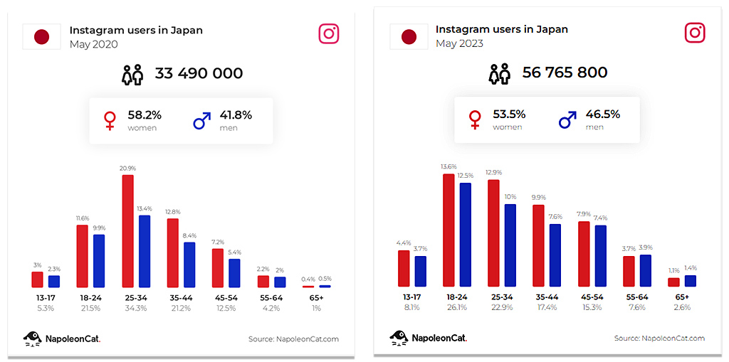 世界で23億人を超えるユーザーを抱えるInstagram。国内のインスタユーザーは、2020年と比べて約2,000万強増え、ユーザーの男女比も縮まっています。中高年では女性より男性のインスタ利用者の方が多いくらいです。