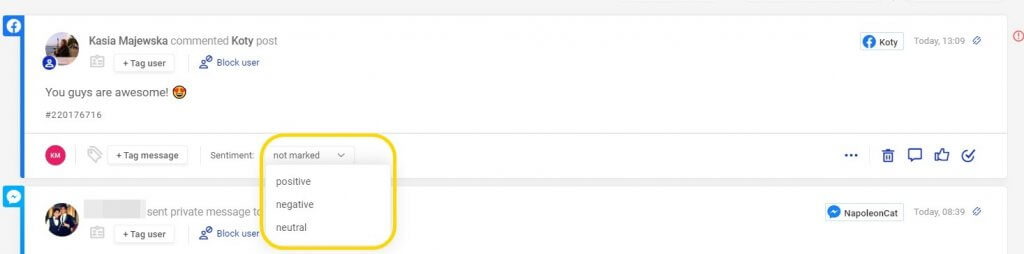 - Sentiment – use NapoleonCat’s Social Inbox to tag the sentiment of every incoming conversation; it can be either positive, negative, or neutral.