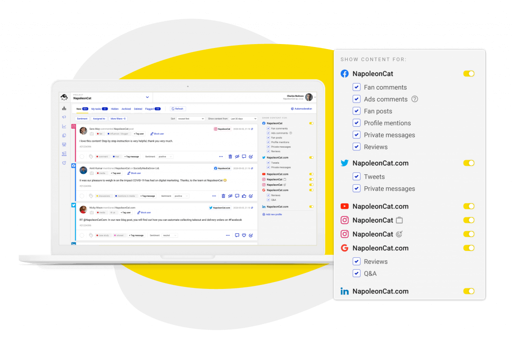 NapoleonCat’s Social Inbox gathers all interactions scattered across various social media platforms. Community managers (and whoever else is involved in the project) have access to communication from all over the place, in one place – a common dashboard.