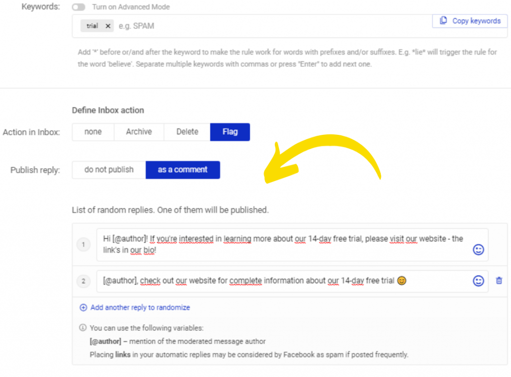 To set up an Auto-moderation rule with NapoleonCat, set relevant keywords and their corresponding automated replies, as seen below.