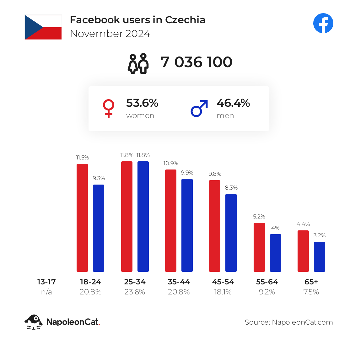 There were 7 036 100 Facebook users in Czechia in November 2024, which accounted for 65.9% of its entire population.