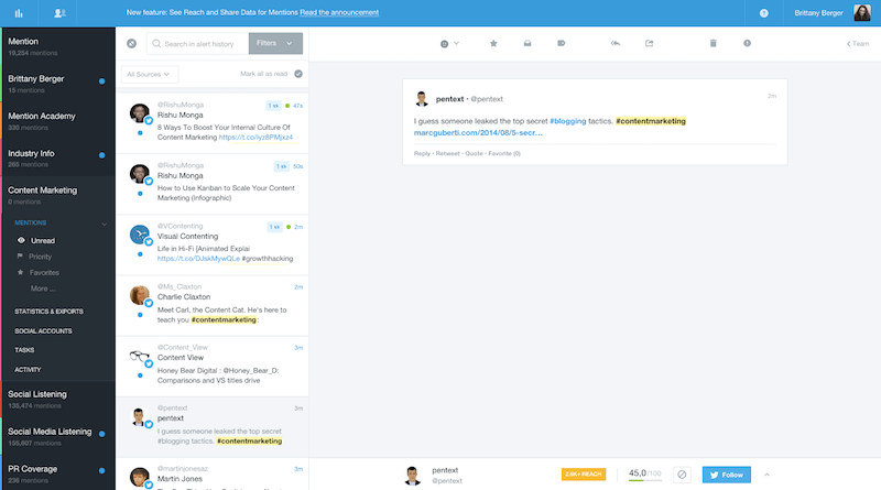 Mention is a social listening tool that keeps track of the direct and indirect mentions of your brand on platforms like Instagram. The platform’s impressive list of functions includes sentiment analysis, meaning you can pick out and prioritize the most negative and positive posts and engage with them to calm the tension or highlight success.
