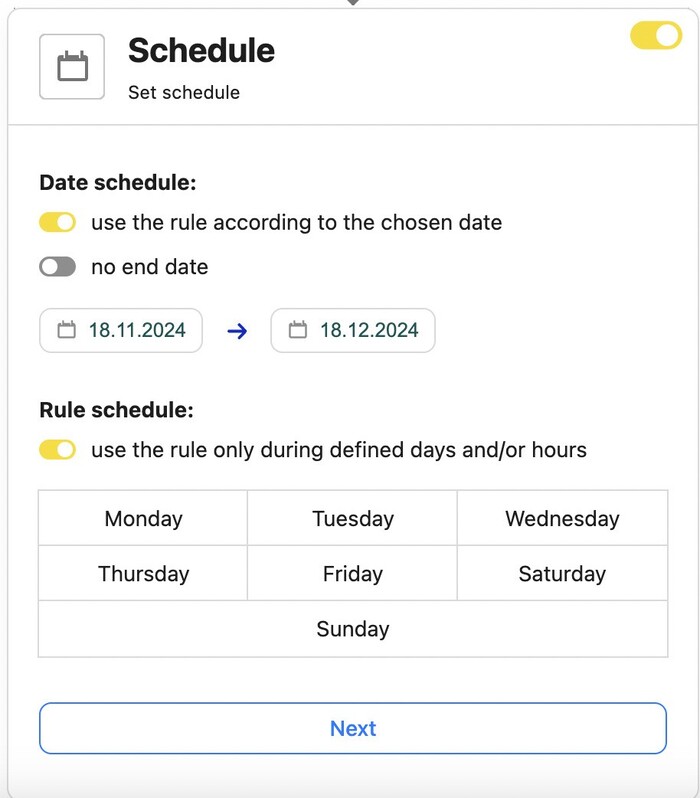 Then complete the rest of the steps and set the schedule for your replies. Decide whether you want the rule to be working 24/7 helping you reply to frequently asked questions all the time, or just when you’re out of the office or during a busy sales campaign to support your team members.