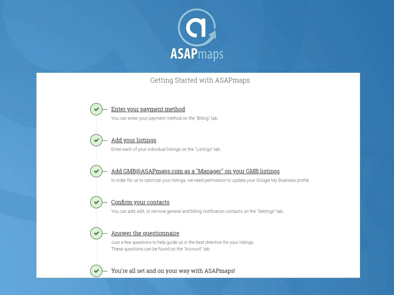 If you’re into automatic solutions, you could also check out ASAPMaps service. This tool will optimize your business on Google on a weekly basis. It connects to your GMB listing, identifies missing data points, and systematically improves them.
