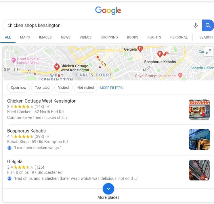 Sticking with the theme of no-nonsense, I’m thinking fast food. Hankering after some fried chicken yet wary that this is an absolute minefield. I’ve no need to fear though really; a great benefit of Google My Business is that it provides real credibility to the top results.