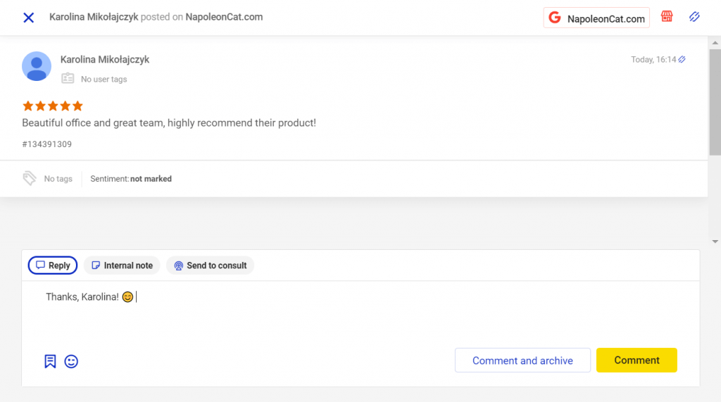 Once you set up your GMB account and learn the ropes, consider using a third-party tool like NapoleonCat to improve the process of communicating with your customers through Google Reviews.