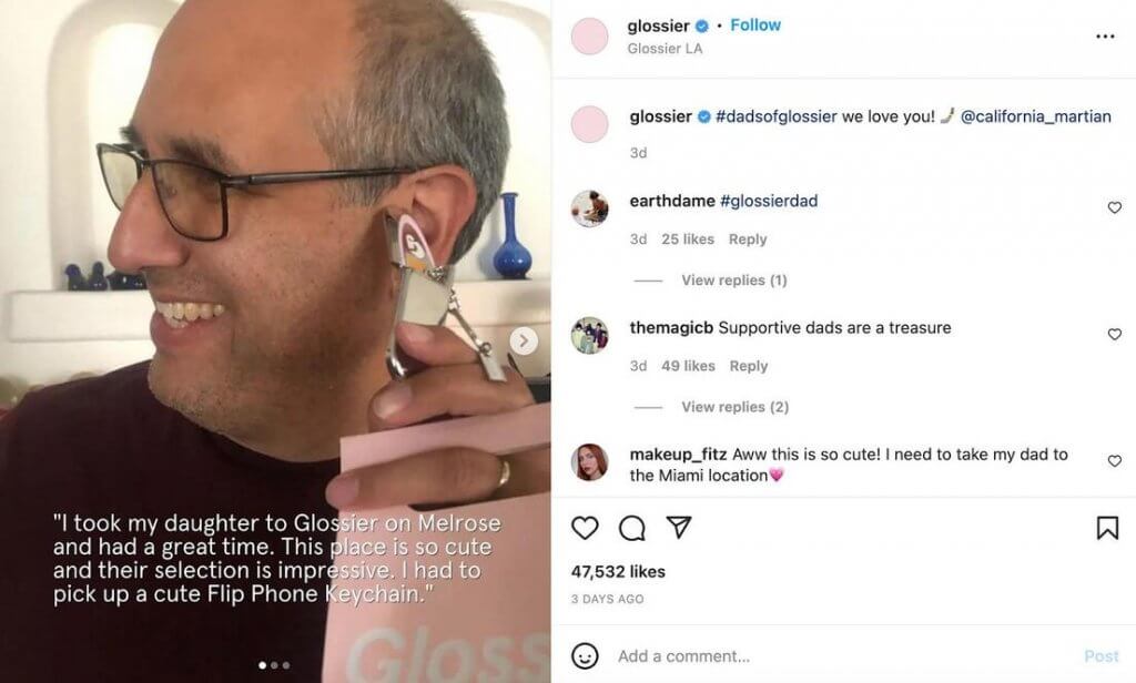 And just take a look at this post from Glossier. I mean, how cute is the #dadsofglossier hashtag? (And I know it’s for a brick-and-mortar store, but there are plenty of ways to do the same for an eCommerce store. Time to get creative!)